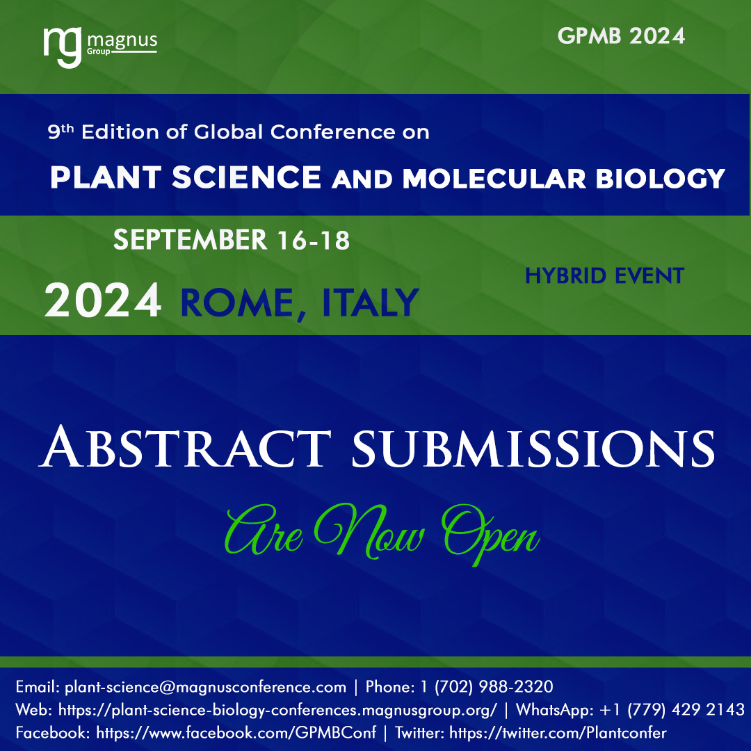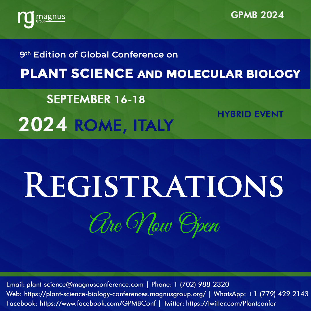 Magnus Group is delighted to announce the much-anticipated "9th Edition of Global Conference on Plant Science and Molecular Biology" (GPMB 2024), a Hybrid Event scheduled to occur in the enchanting city of Rome, Italy, and virtually from September 16-18, 2024.