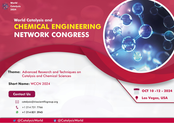 World Catalysis and Chemical Engineering Network Congress (WCCN 2024– Hybrid Edition) is planned for October 10-12, 2024, in Las Vegas, USA. WCCN 2024 holds the theme “Advanced Research and Techniques on Catalysis and Chemical Science” with the broad discussion regarding Inorganic and Organic Chemistry, Organometallics, Photo Catalysis, Green Chemistry, Coordination Chemistry, Bio-inorganic Chemistry, Environmental Catalysis, Supramolecular Chemistry, and Computational chemistry, and Computational Chemistry.
