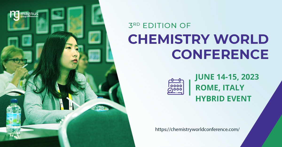 Magnus Group is proud and honoured to invite you to its leading global standard conference in chemistry, 3rd Edition of Chemistry World Conference (Chemistry 2023) which is going to be held in a hybrid format at Rome, Italy and Virtually during June 14-15, 2023.